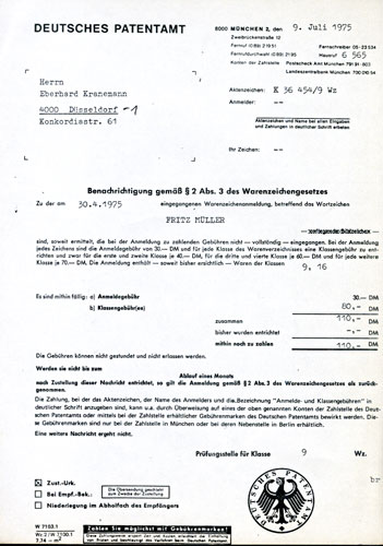 Eberhard Kranemann meldet seinen Künstlernamen FRITZ MÜLLER 1975 beim Deutschen Patentamt als Warenzeichen an